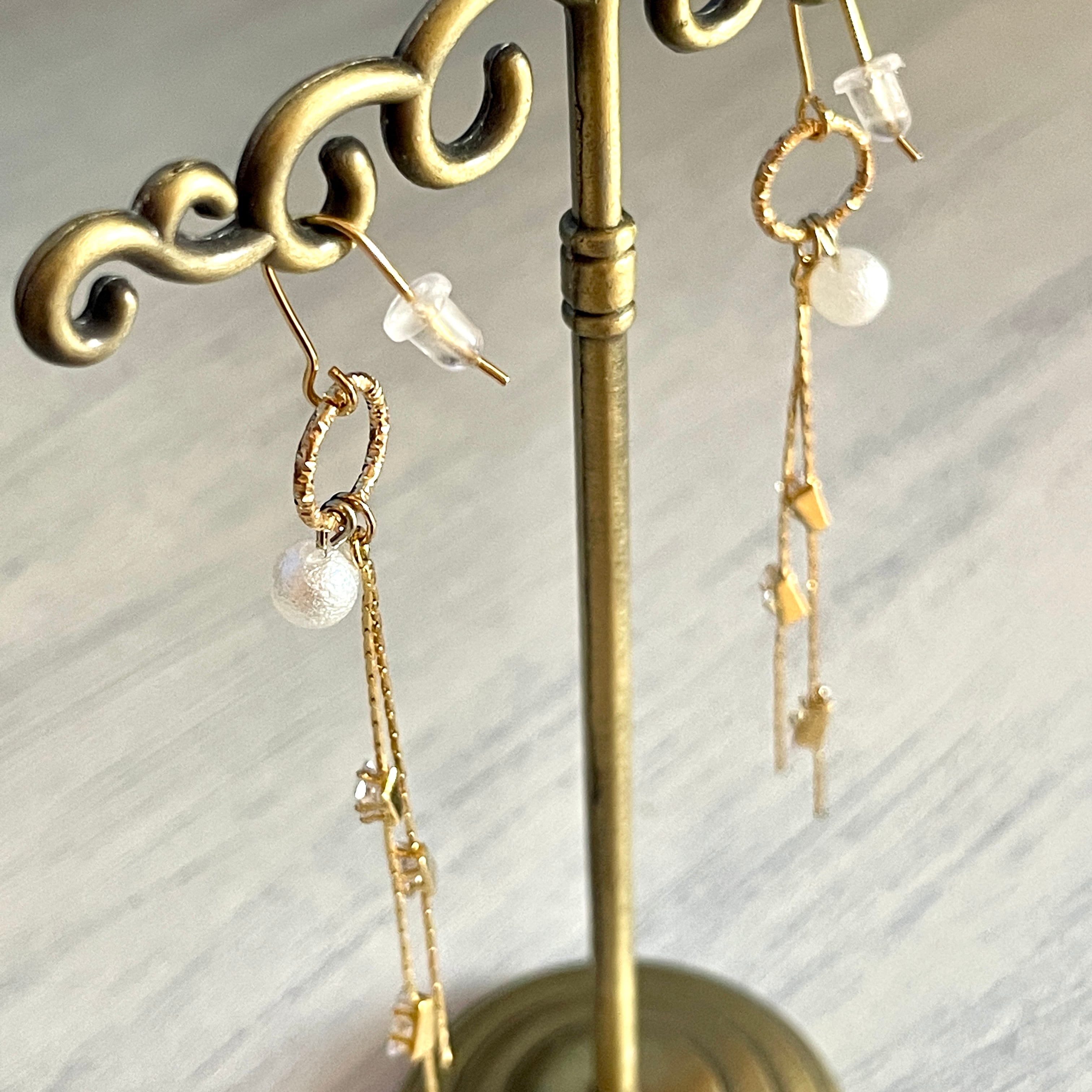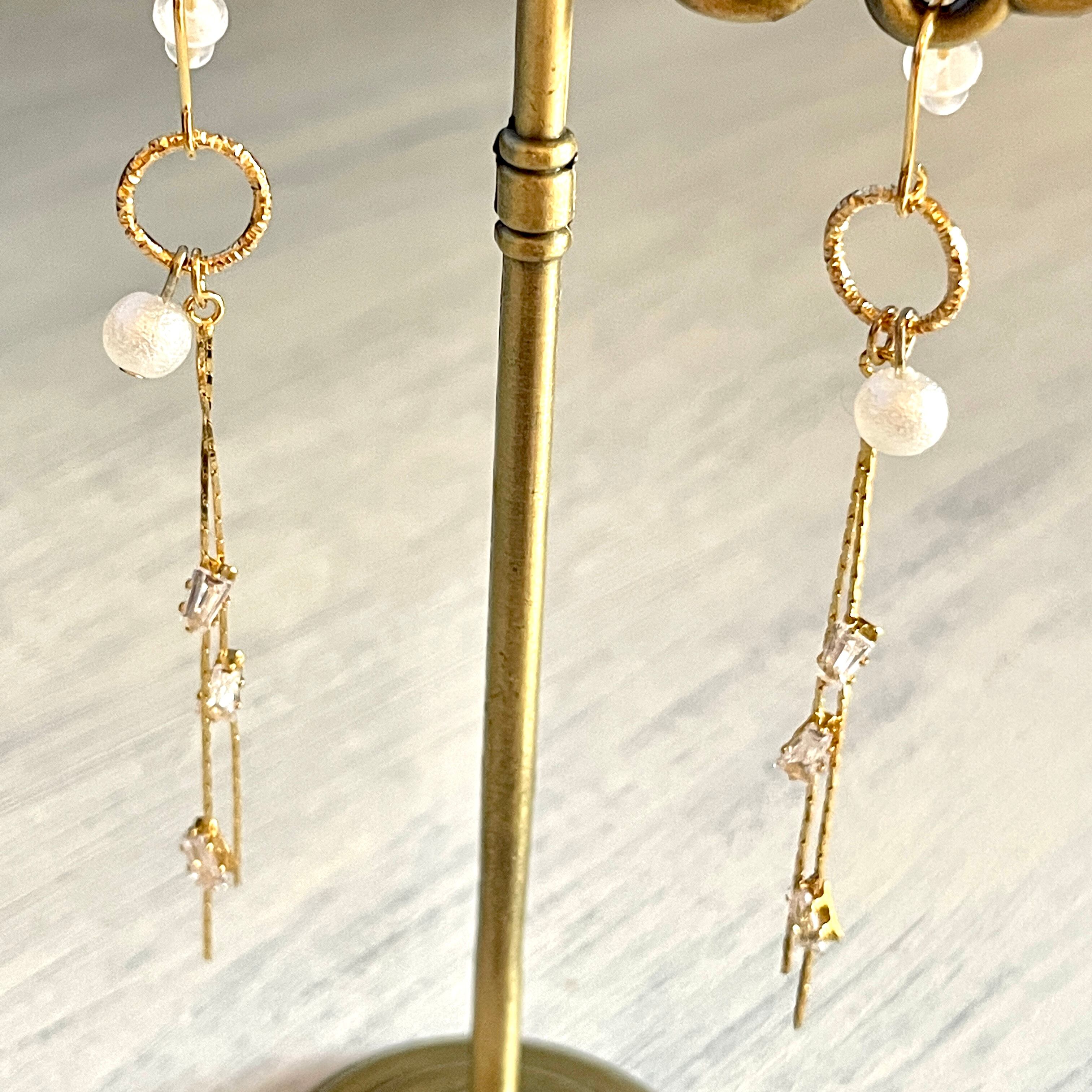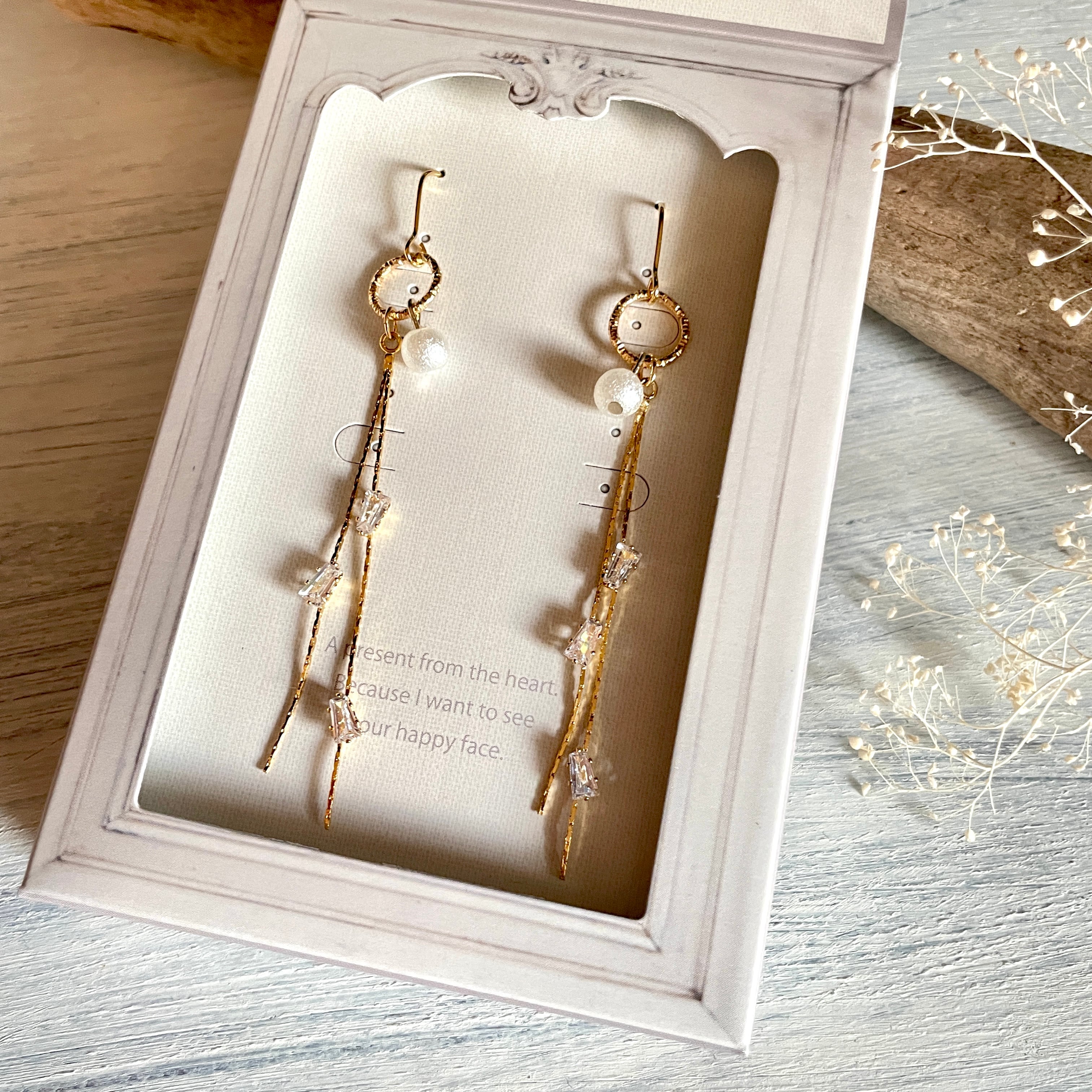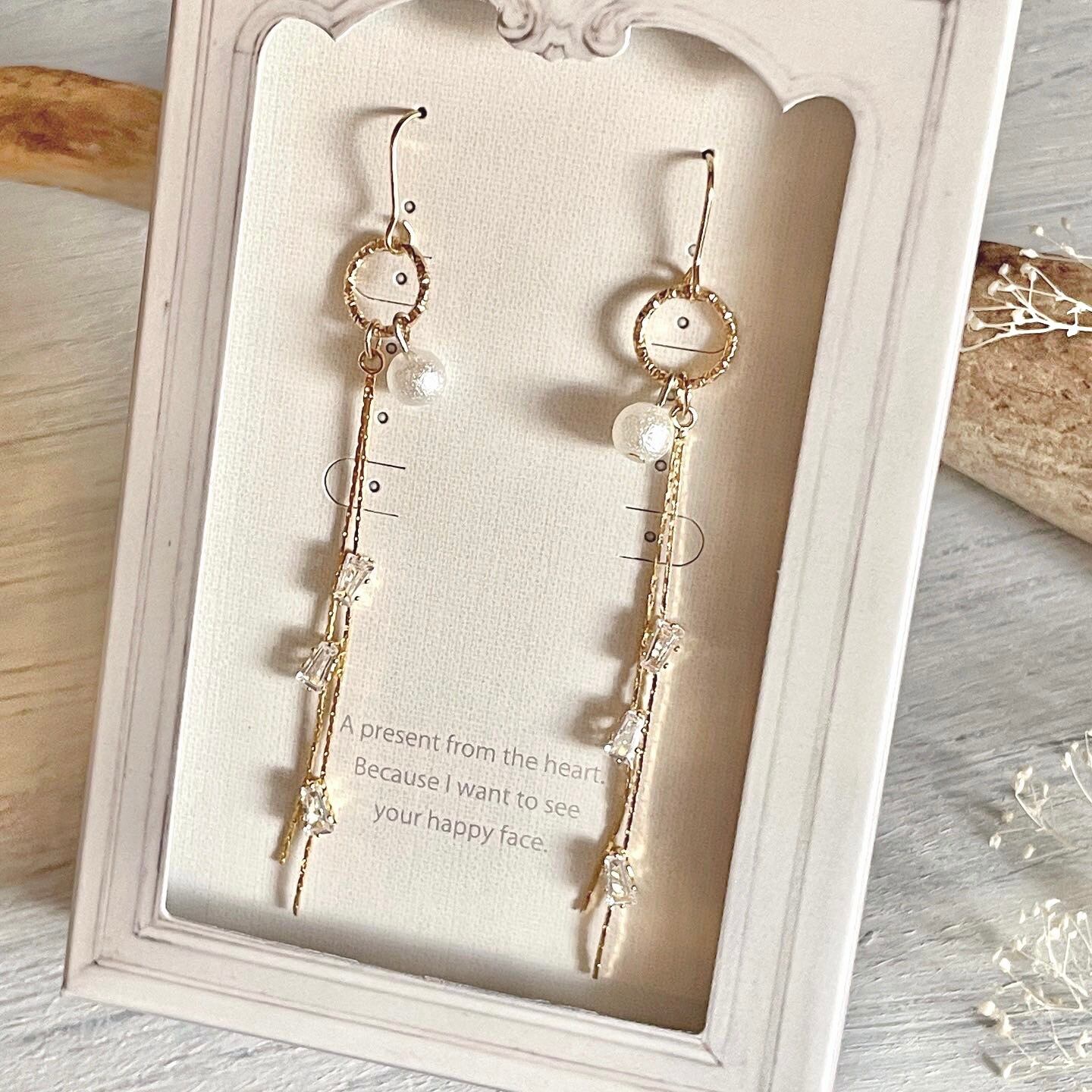 優しいポンポンパールとキラキラ輝く四角いストーンで作ったピアスです。