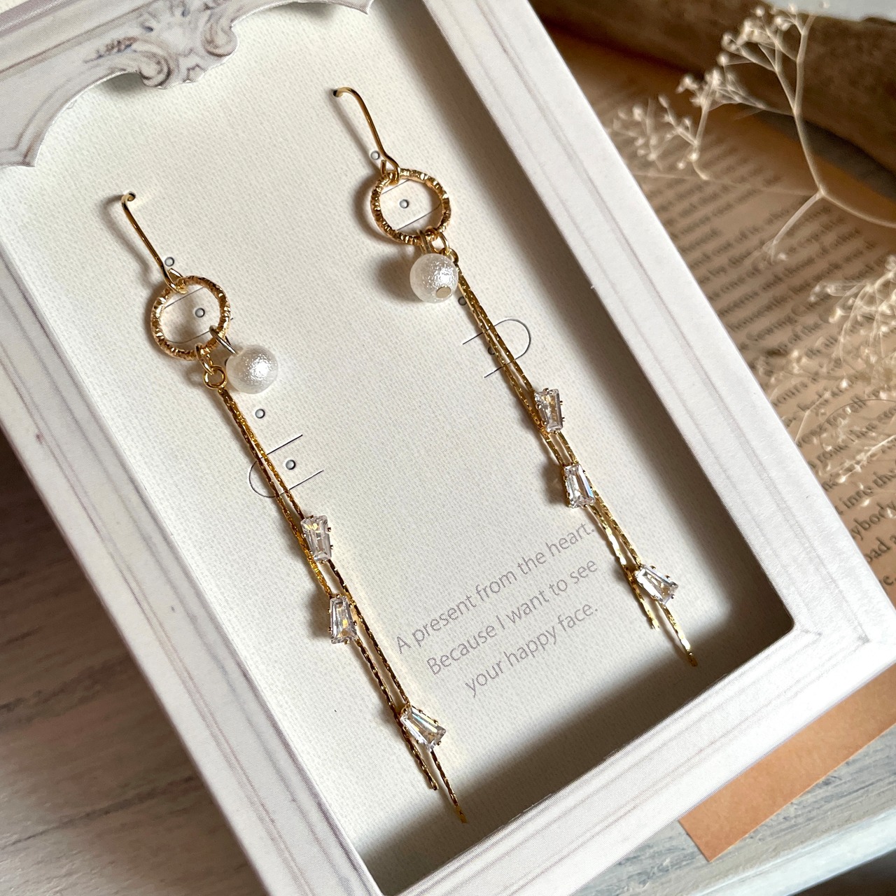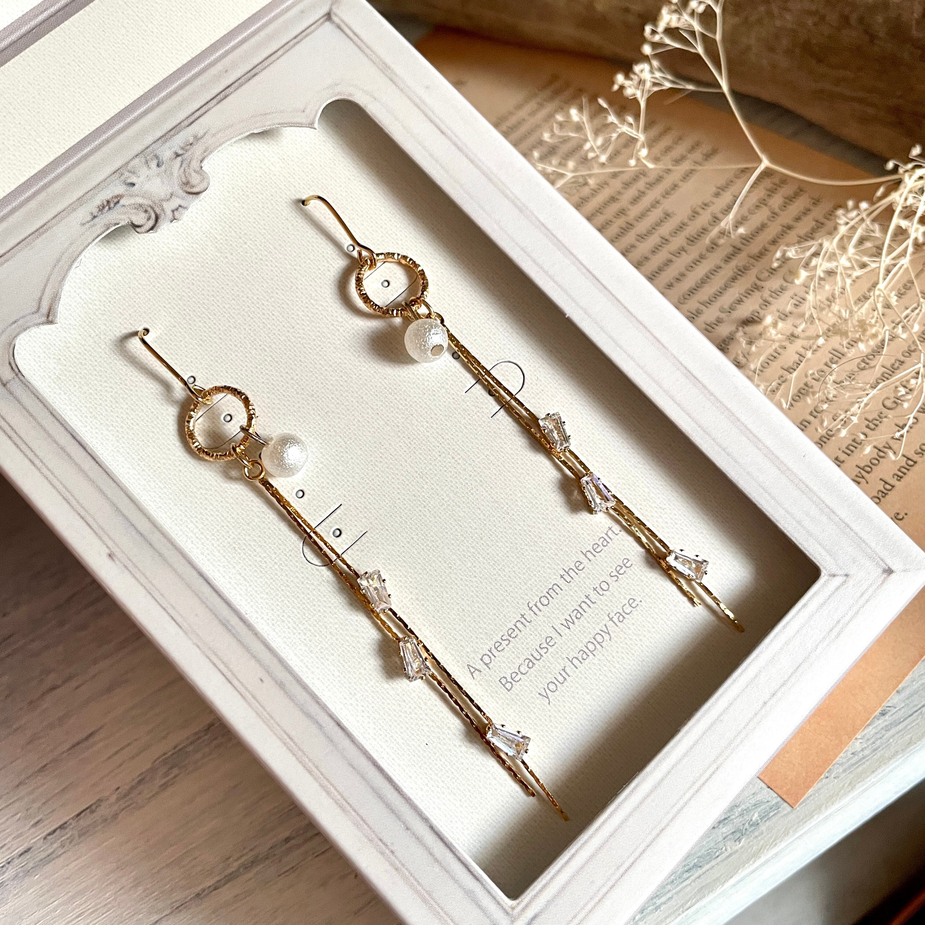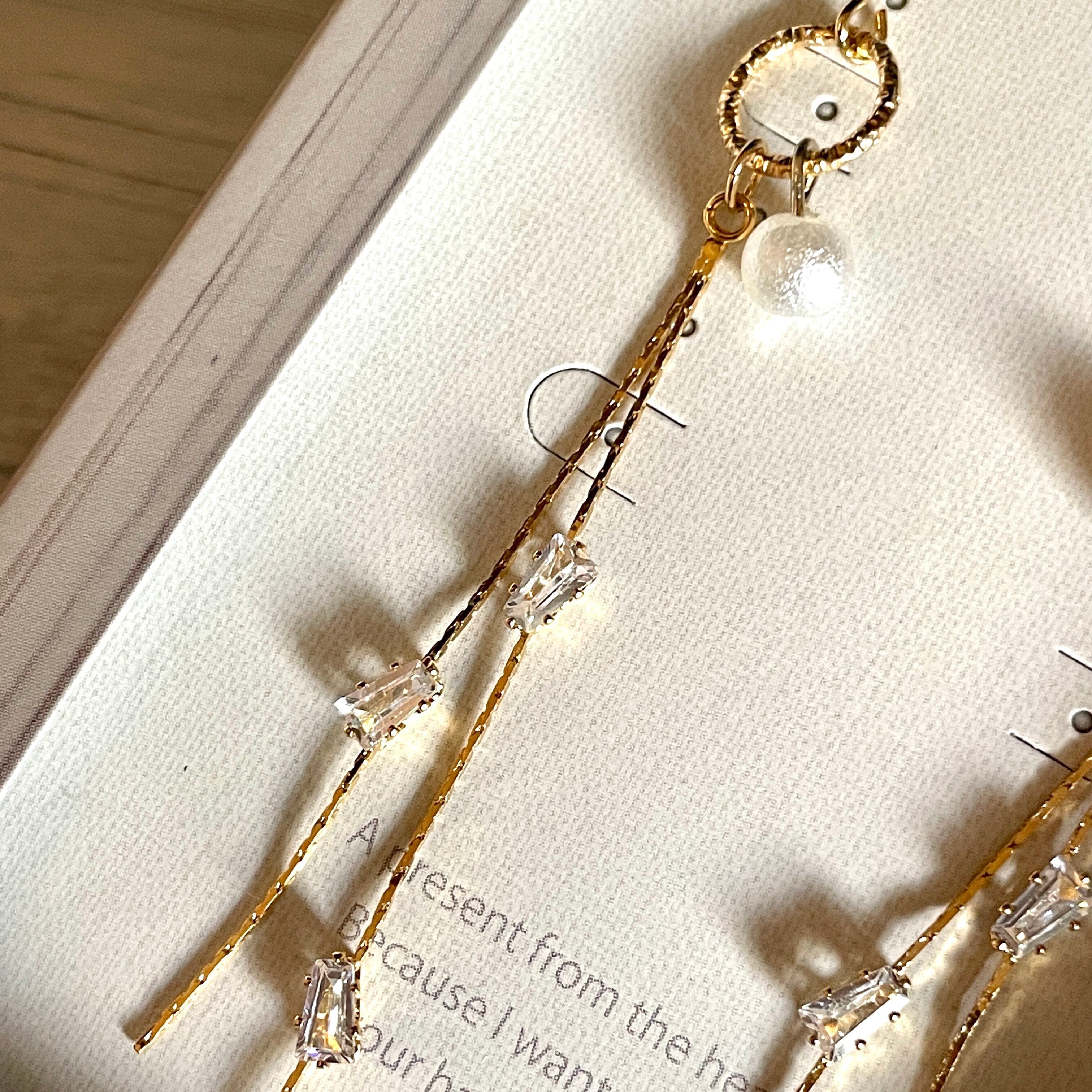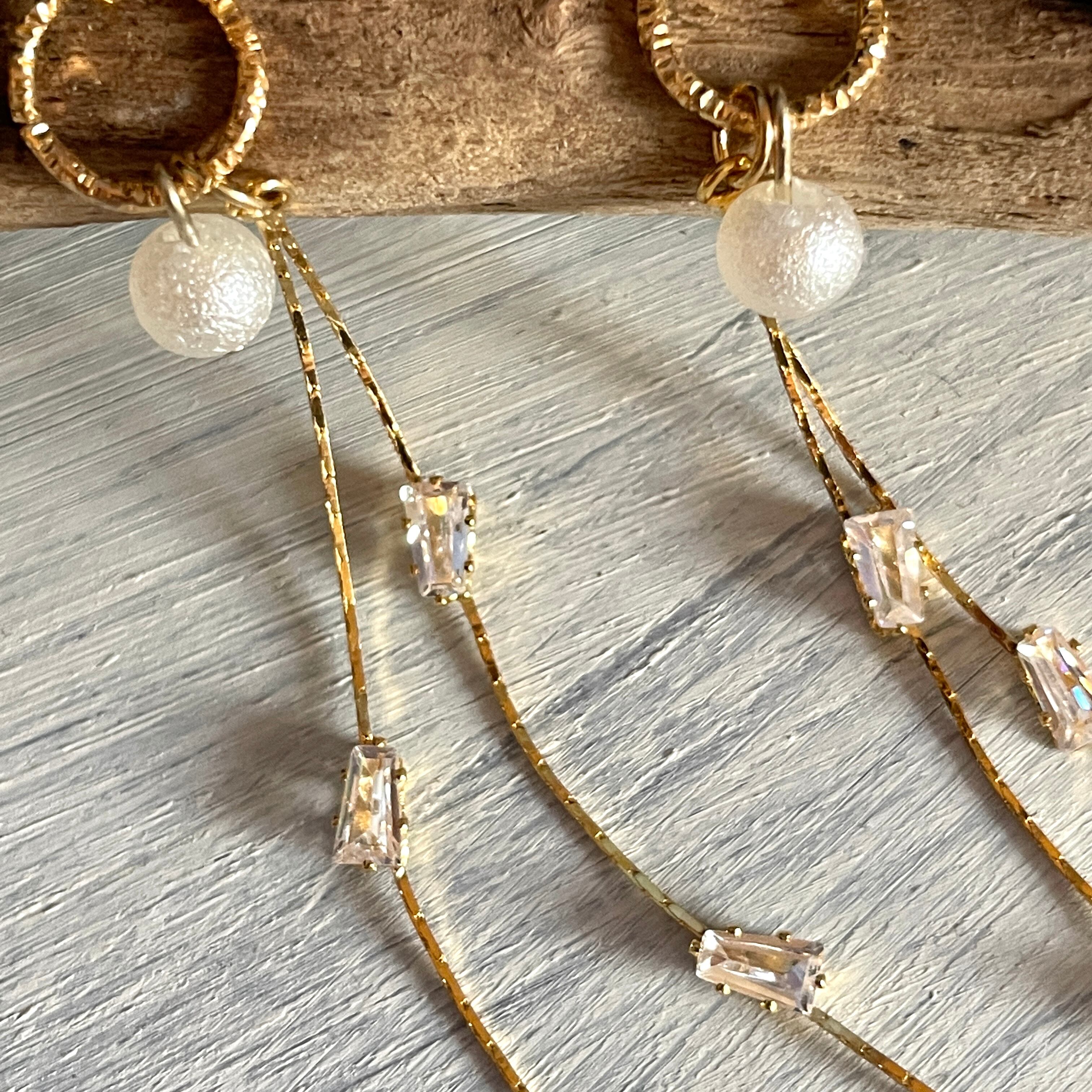 優しいポンポンパールとキラキラ輝く四角いストーンで作ったピアスです。
