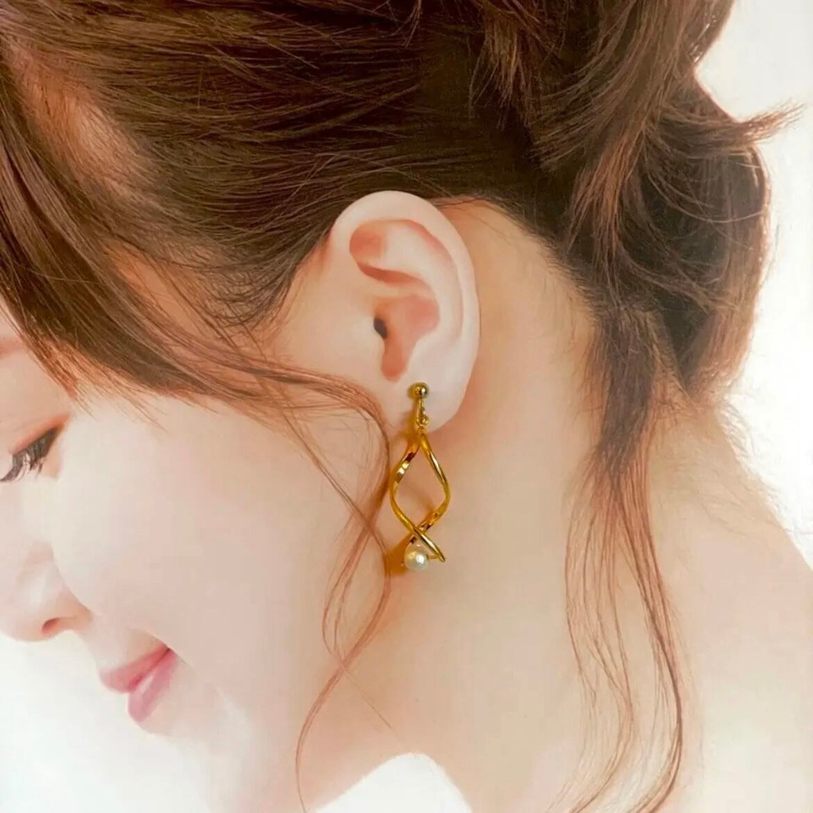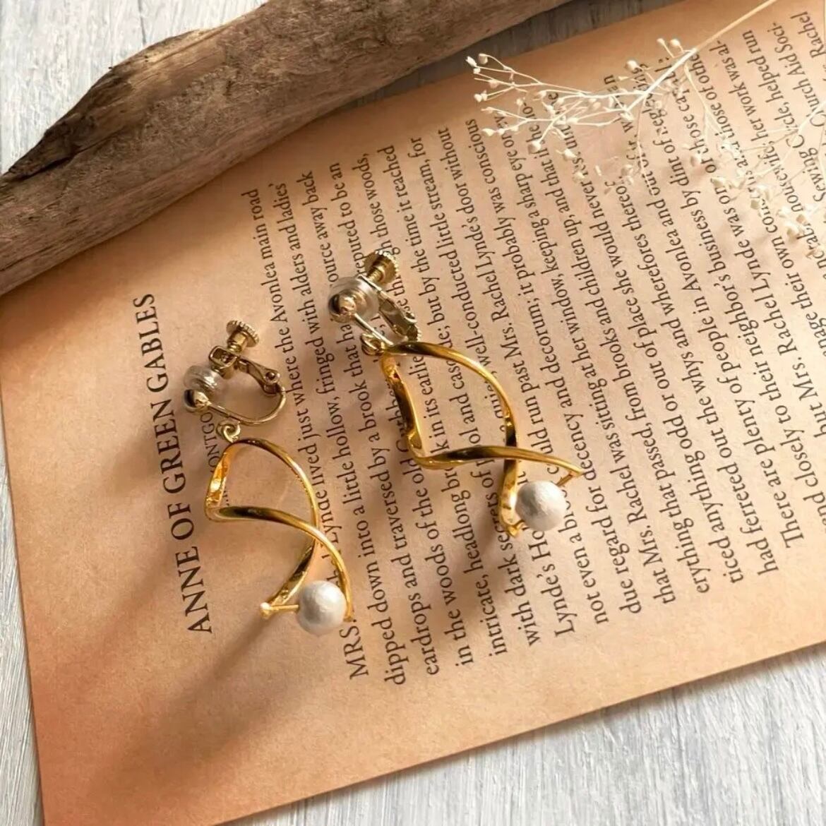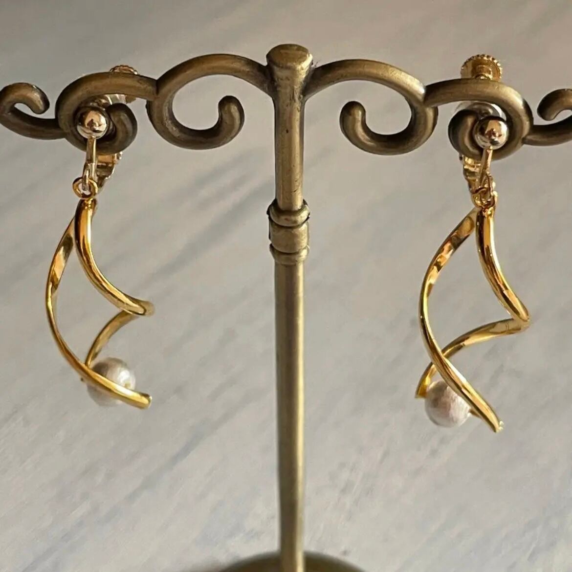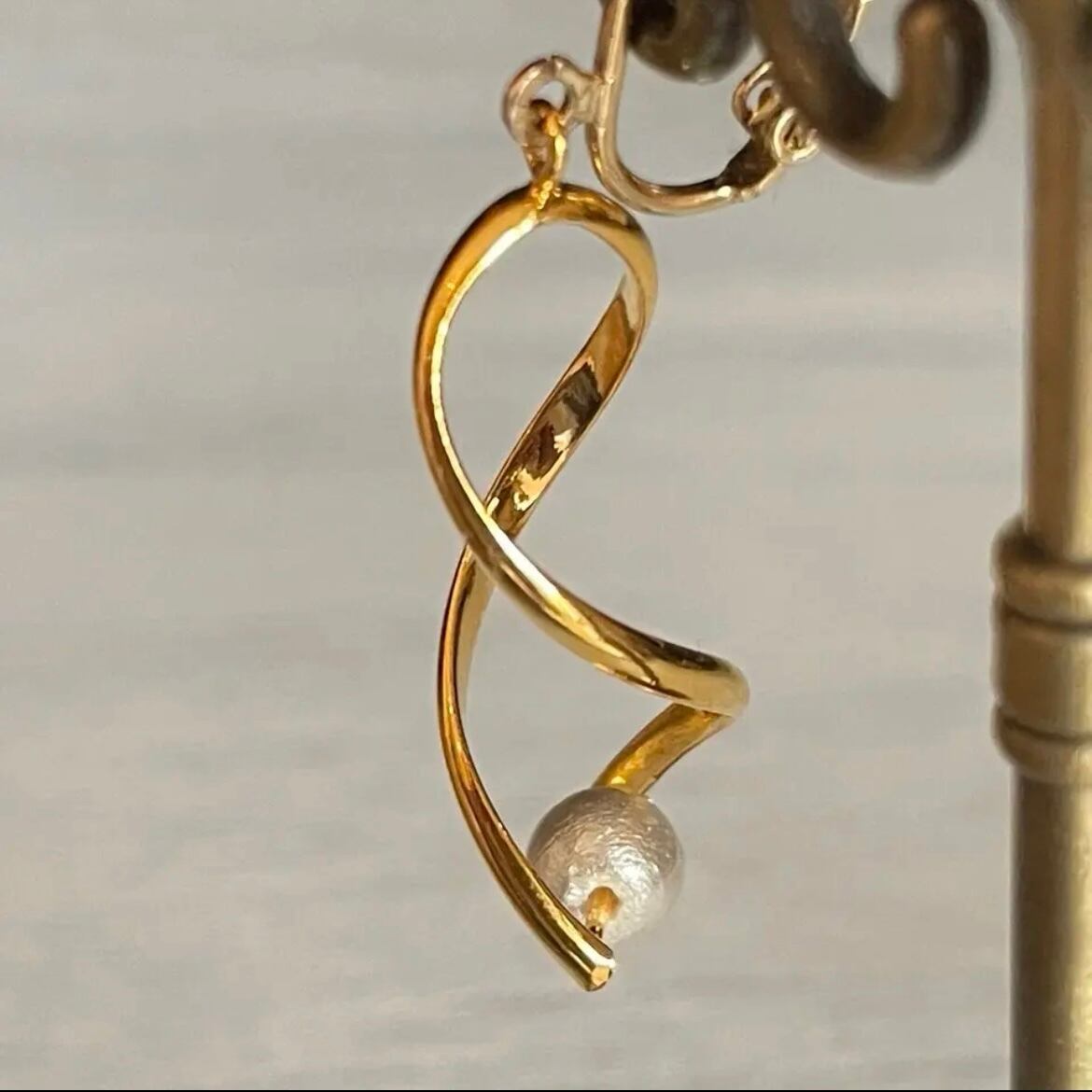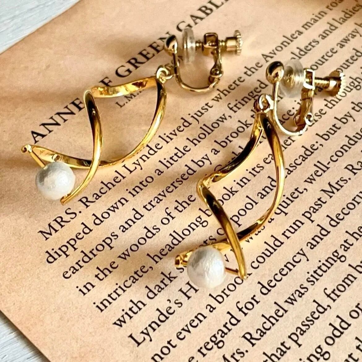 ひねりのあるゴールドとコットンパールを組み合わせた大人可愛いイヤリング(ピアス変更可能)