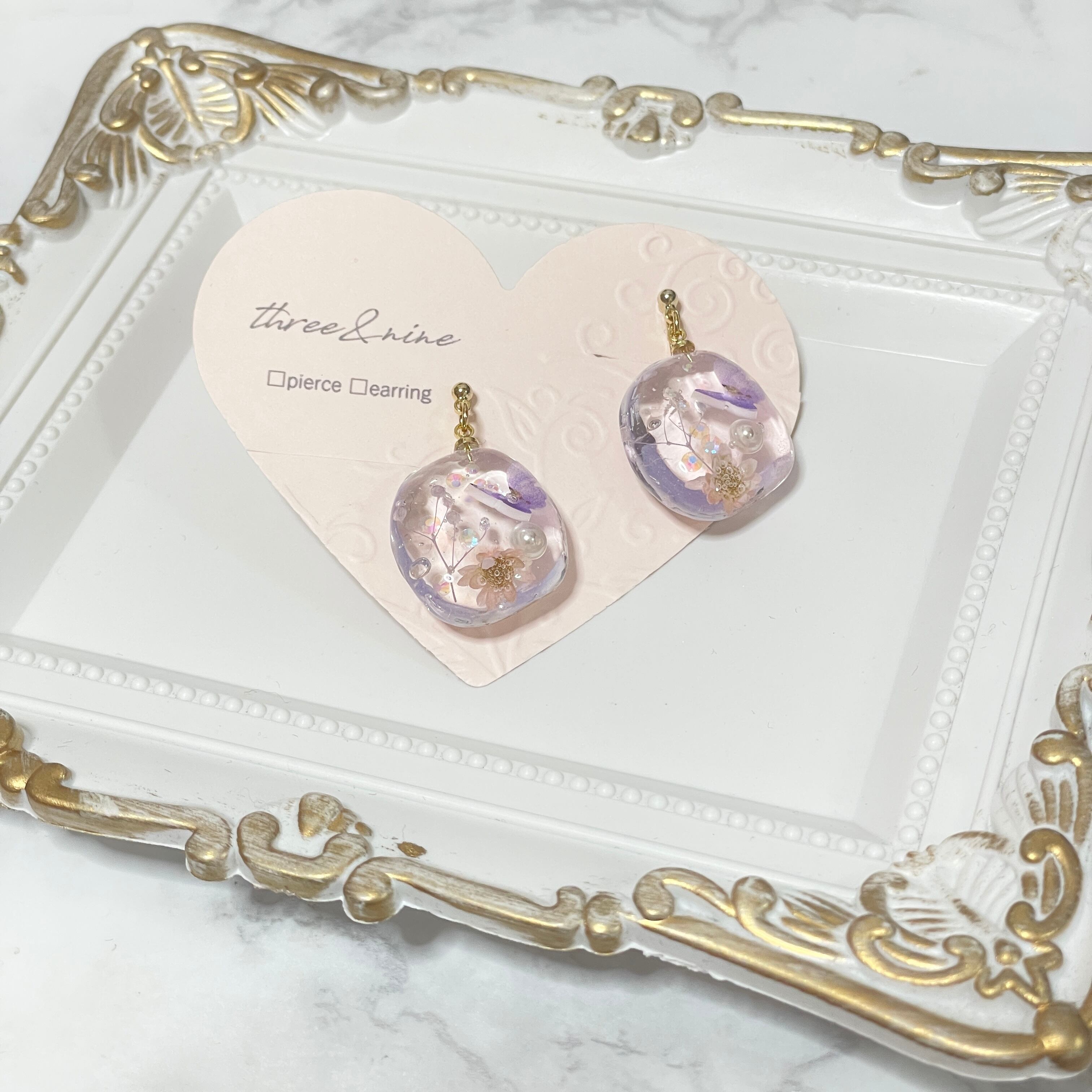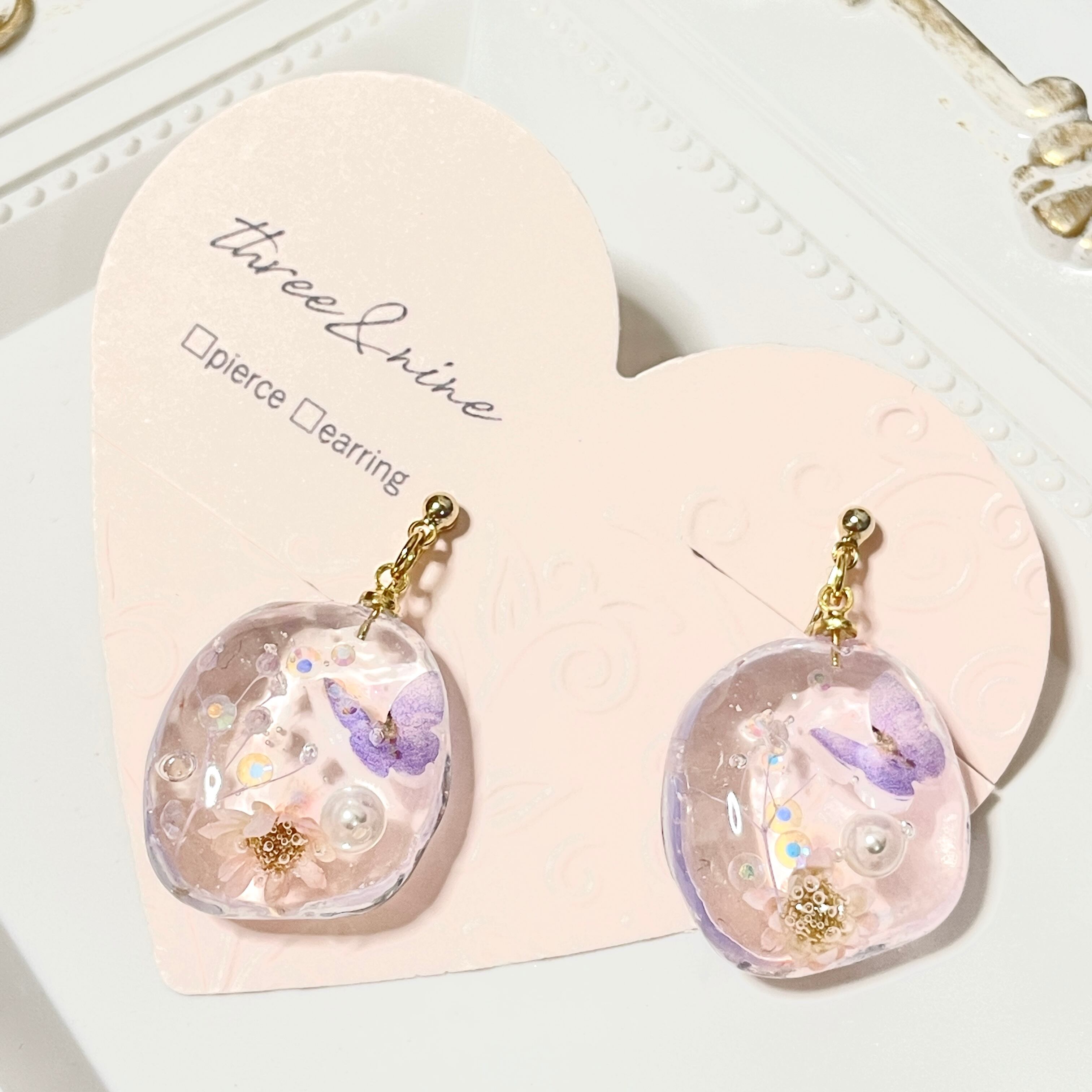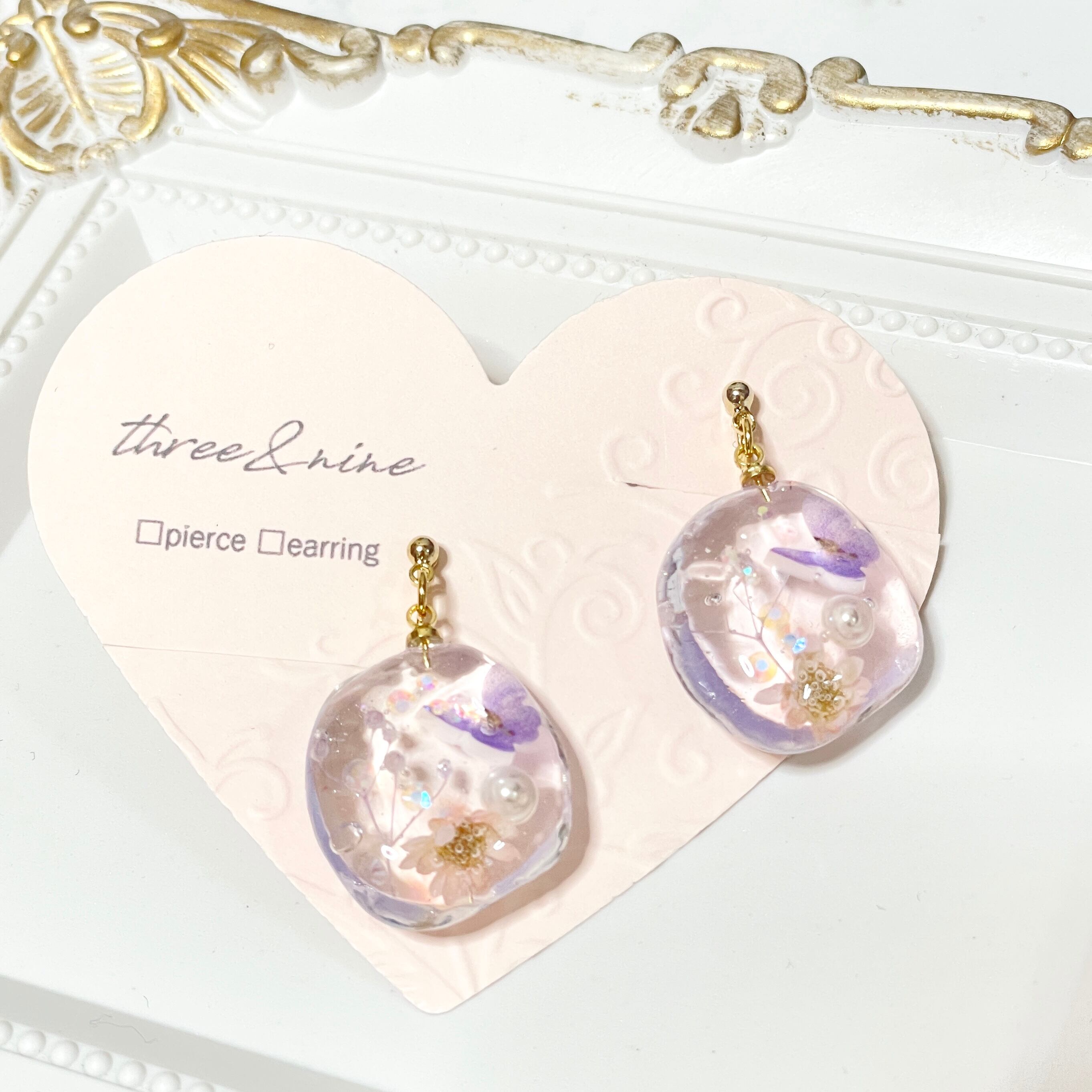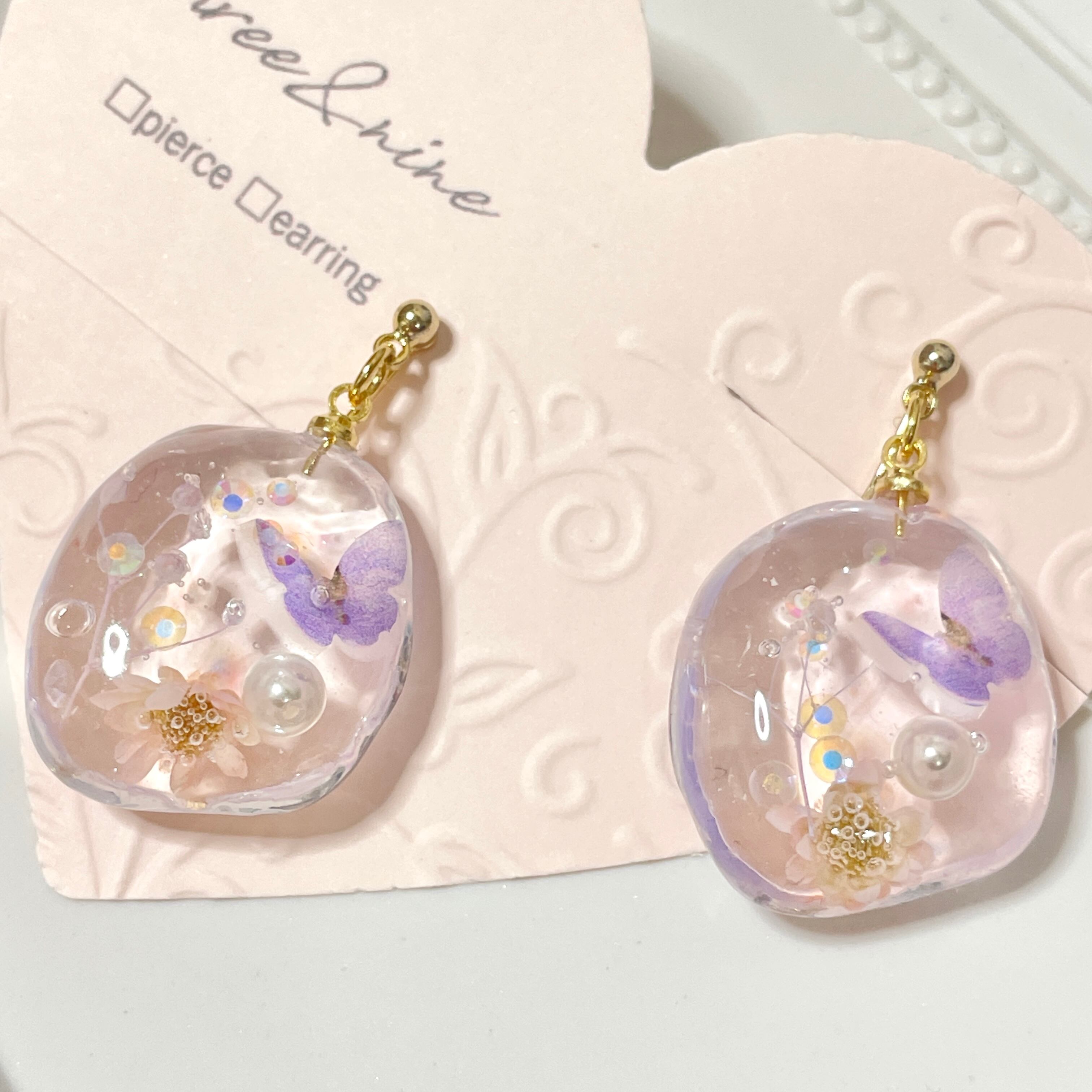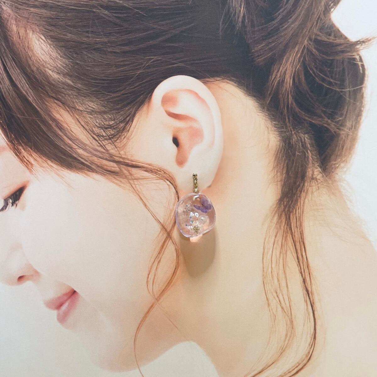 ツヤ感と透明度の高いレジンの中に可愛らしい小花が寄り添うデザインで ほんのりとした華やかさを演出し、耳元で揺れるキラキラの小花たちがオシャレを一層引き立てます。