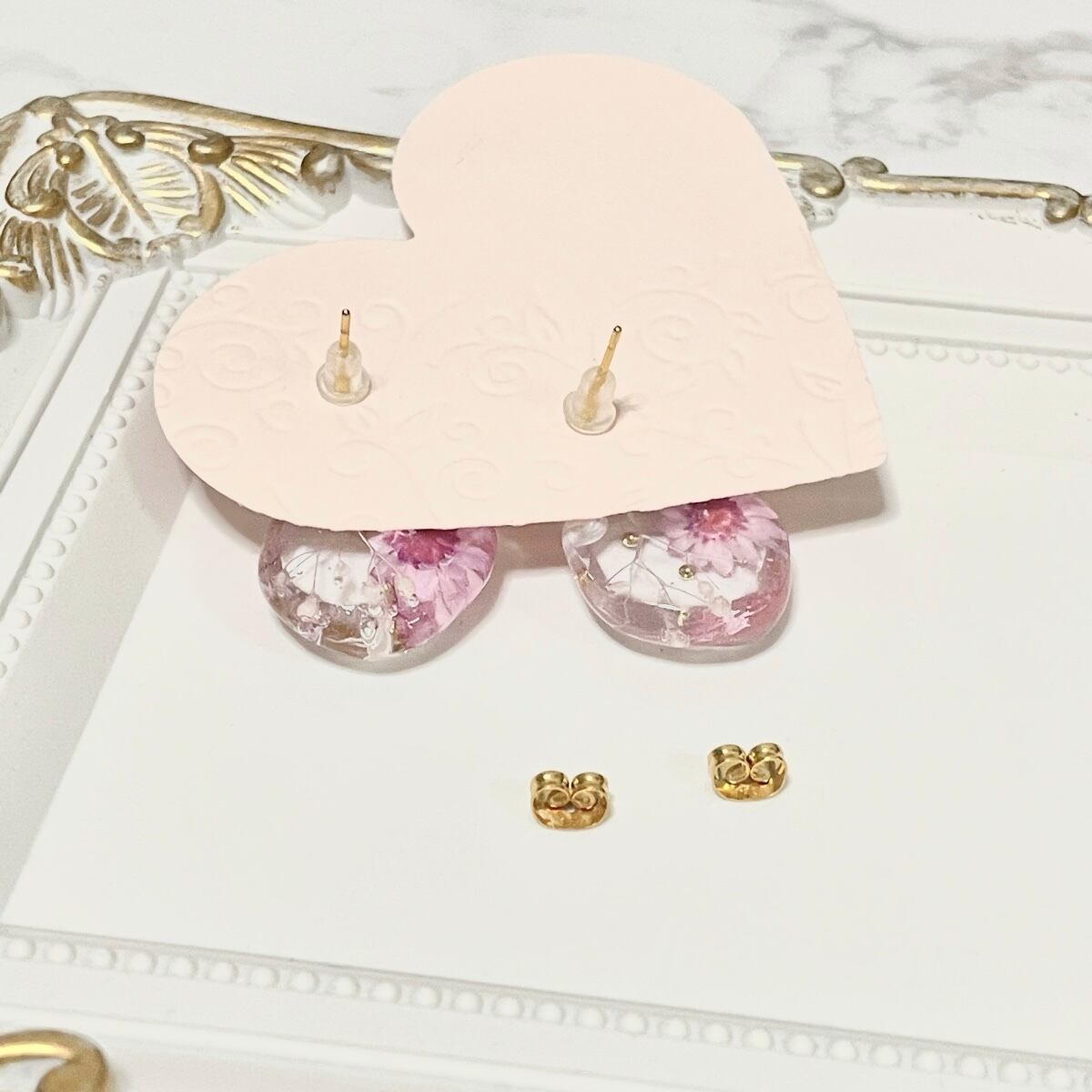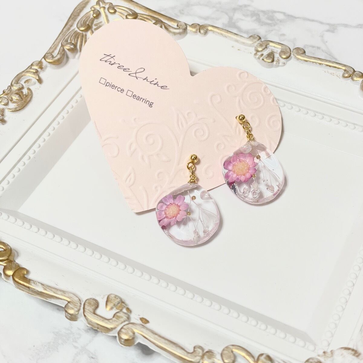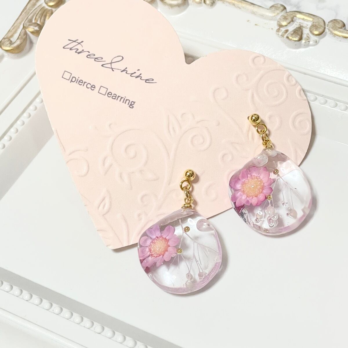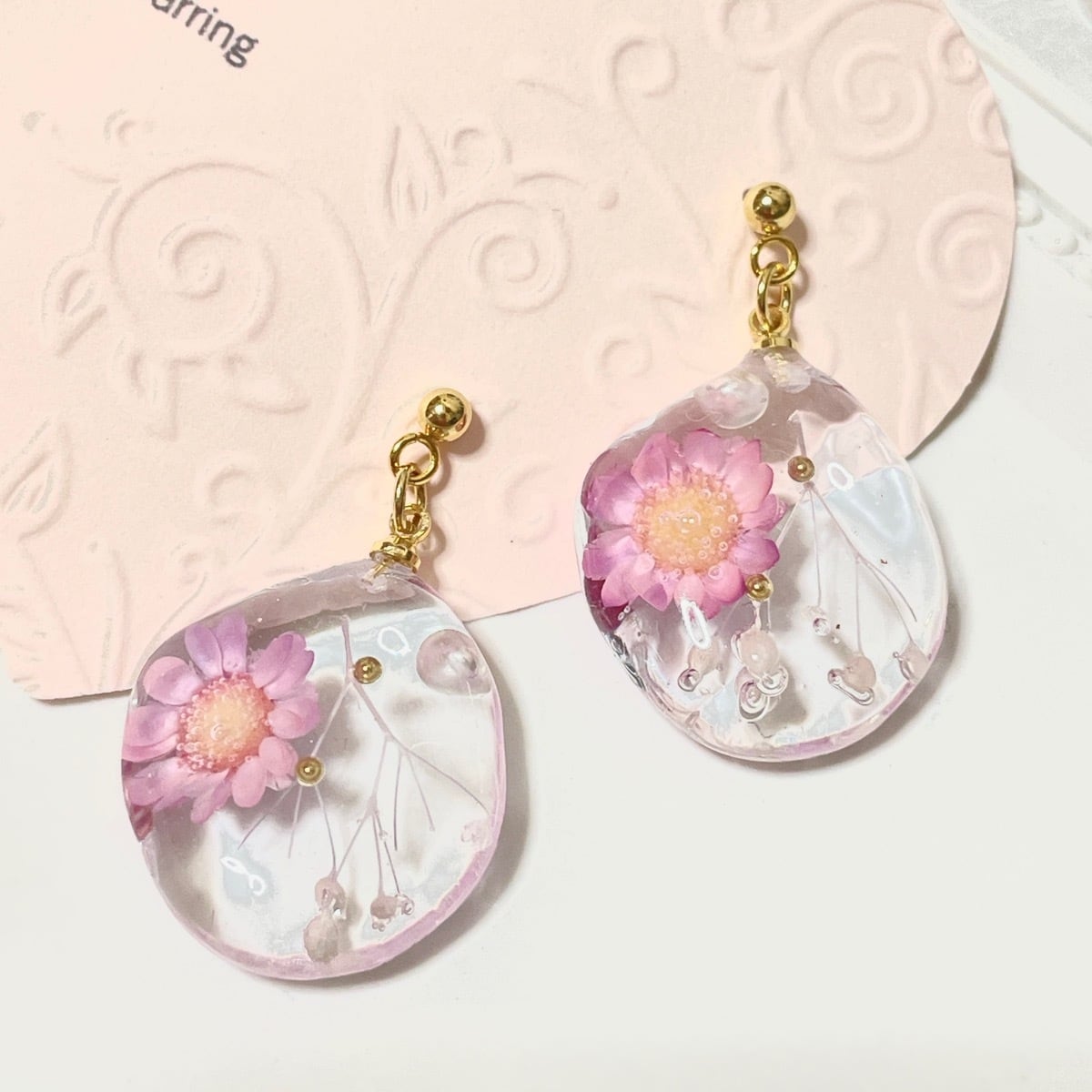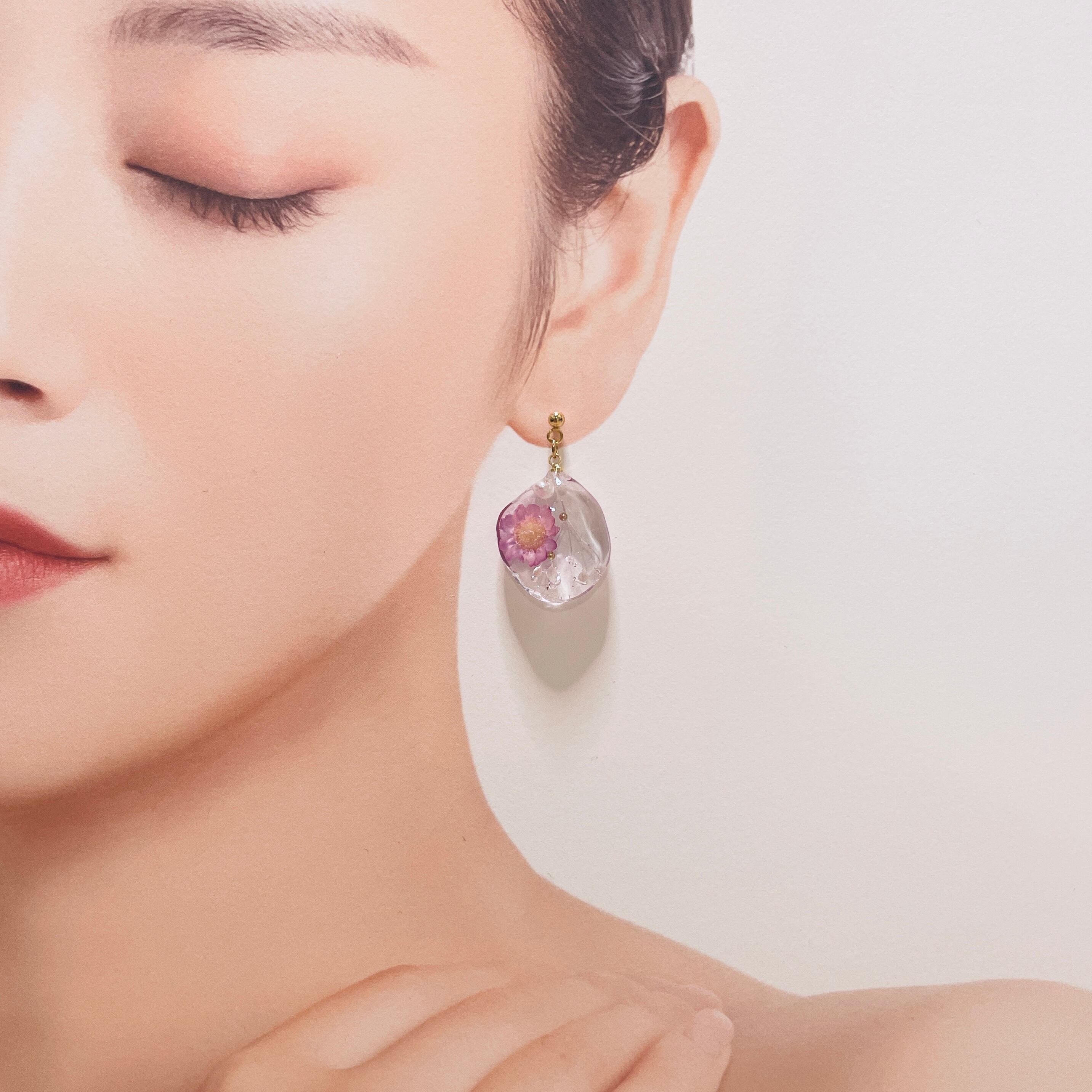 ツヤ感と透明度の高いレジンの中に可愛らしい小花が寄り添うデザインで ほんのりとした華やかさを演出し、耳元で揺れるキラキラの小花たちがオシャレを一層引き立てます。